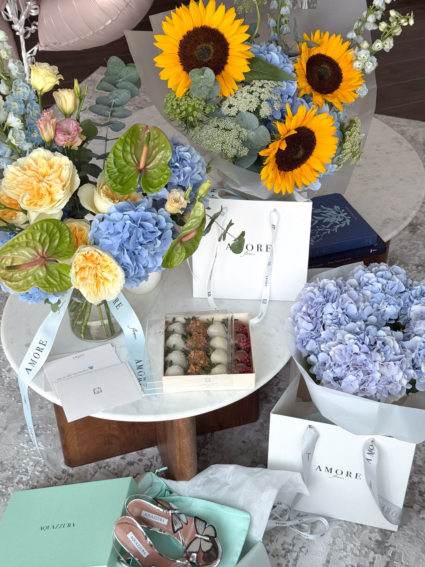 Besides classic bouquets, we also offer decoration services for small private events, flower subscription deliveries, as well as delicious Belgian chocolate– covered strawberries and balloons.
